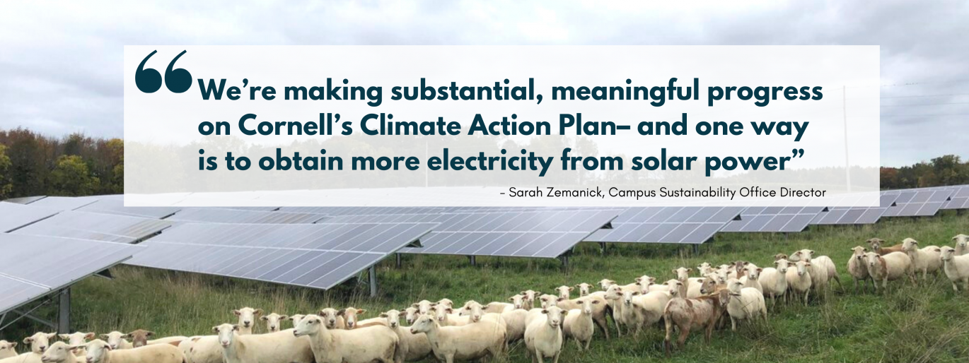 The new Cascadilla Community Solar Farm comes online, doubling the clean and renewable electricity being used by the University and bringing the overall number to 20% . The new solar farm is cared for by sheep who mow the grass, cutting down on fossil fuels in landscaping.