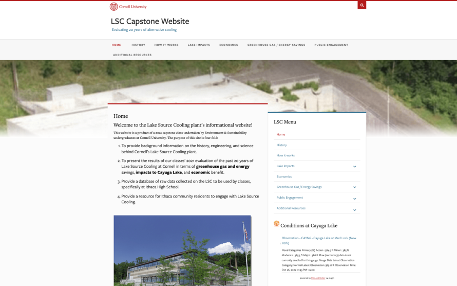 Students were split into four teams, and created a final report published as a website to share their results. LSC is a unique experiment in alternative methods of climate control for a large facility, taking advantage of its proximity to the depths of Cayuga Lake. The course was able to provide a data analysis that was useful to campus Facilities and Utilities staff to understand whether the plant and project had met its intended goals.