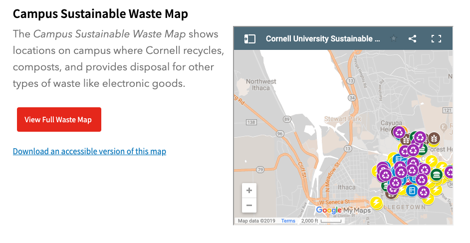 Note that the sustainability maps landing page includes the Waste Map, and two additional Cornell Sustainability Maps.  This page links to an accessible version of the map.