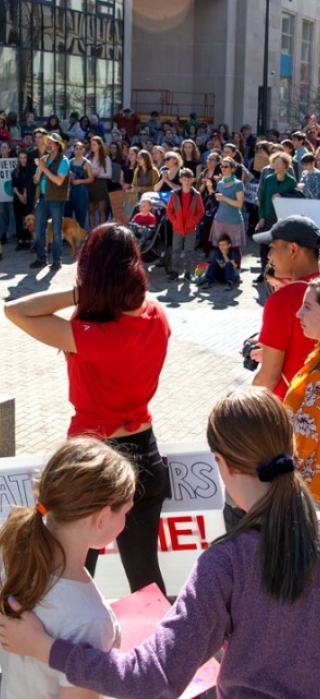 About 250 students from Cornell, Ithaca High School and other local schools marched, chanted and rallied against a warming world as part of the Global Climate Strike March 15 at the Bernie Milton Pavilion on the Ithaca Commons.