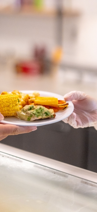 A staff member hands a plate of Halal food to a student at Morrison Dining's dedicated Halal platform.