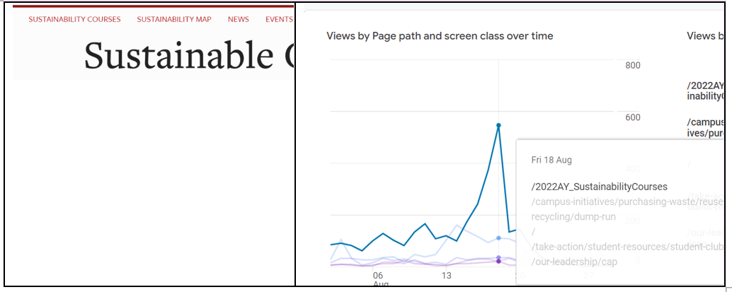 “We put the link to the sustainability courses at top left corner of our webpage (eyebrow navigation) and it got great reach,” she observes. Lisa shared this Google Analytics graph showing a spike in page views the day after the link was moved.