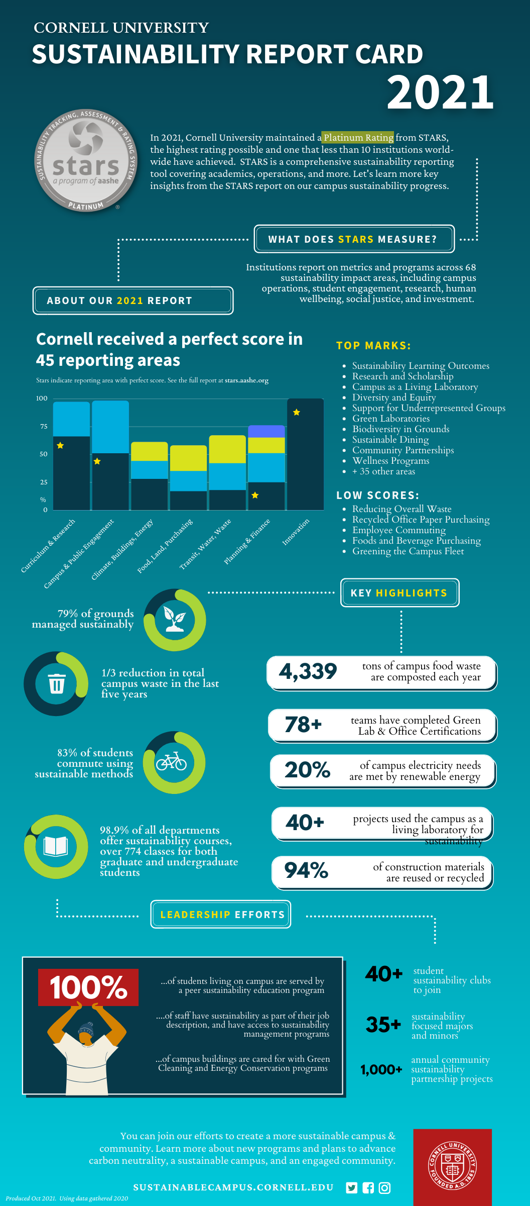 Cornell University has made significant progress in sustainability across all areas of reporting, despite the challenges posed by the COVID-19 pandemicCornell is the only campus in the world to have received a Platinum Rating for three consecutive years.  Of the four major areas of reporting, this year Cornell received a score of 99% in Academics, 98% in Engagement, 79% for Operations, and 78% for Planning and Administration, as well as a full score for innovation credits. Full points were achieved in 36 out of 65 reporting areas.