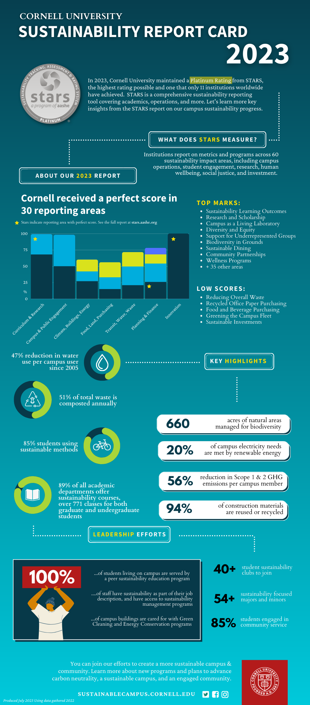 • Each campus, including Cornell, has a unique culture and operational framework that require our community to innovate and create a culture of sustainability in ways that may not be captured by STARS.  Even if our campus was able to achieve a perfect STARS Score, it would be the beginning of a leadership journey in sustainability, not the end.