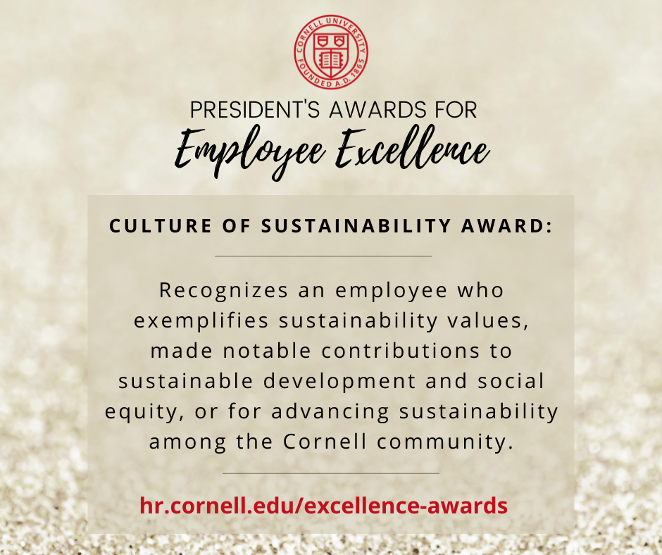 Honoring the importance of sustainability stewardship, culture, and contributions by employees, the President's "Culture of Sustainability" is for one individual with a significant contribution to Cornell's sustainability values, progress, and innovation. To learn more about award criteria, visit the Human Resources website.